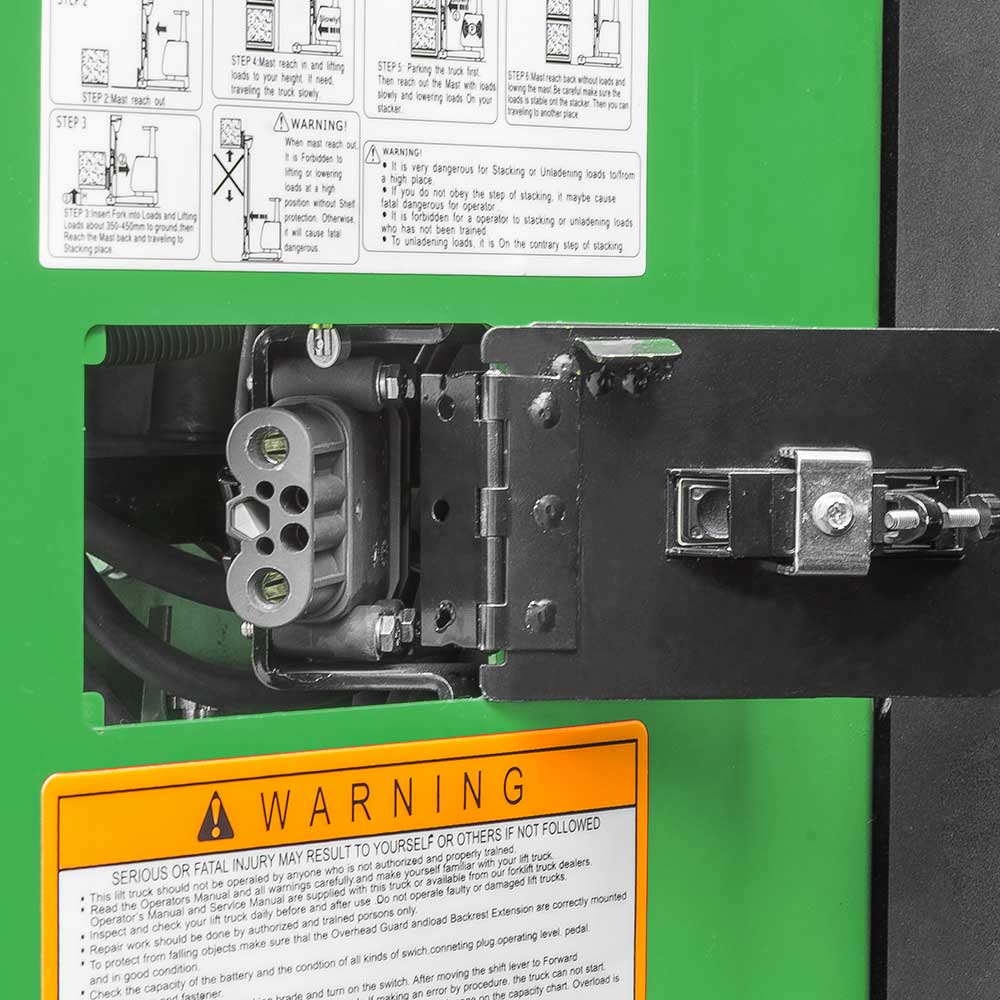 Charging plug inside operator's compartment, this eliminates the need to disconnect the plug from battery, enhancing ease of operation (Std.)