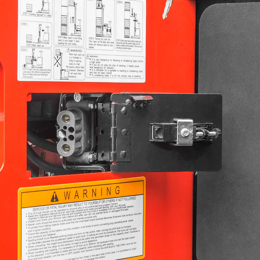 Charging plug inside operator's compartment, this eliminates the need to disconnect the plug from battery, enhancing ease of operation (Std.)