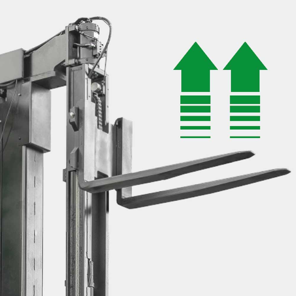 The narrow aisles required for operations and the fork lift height up to 470.4 inch maximize the space availability of your warehouses. The high lift mast boasts high load capacity and improved stacking efficiency.