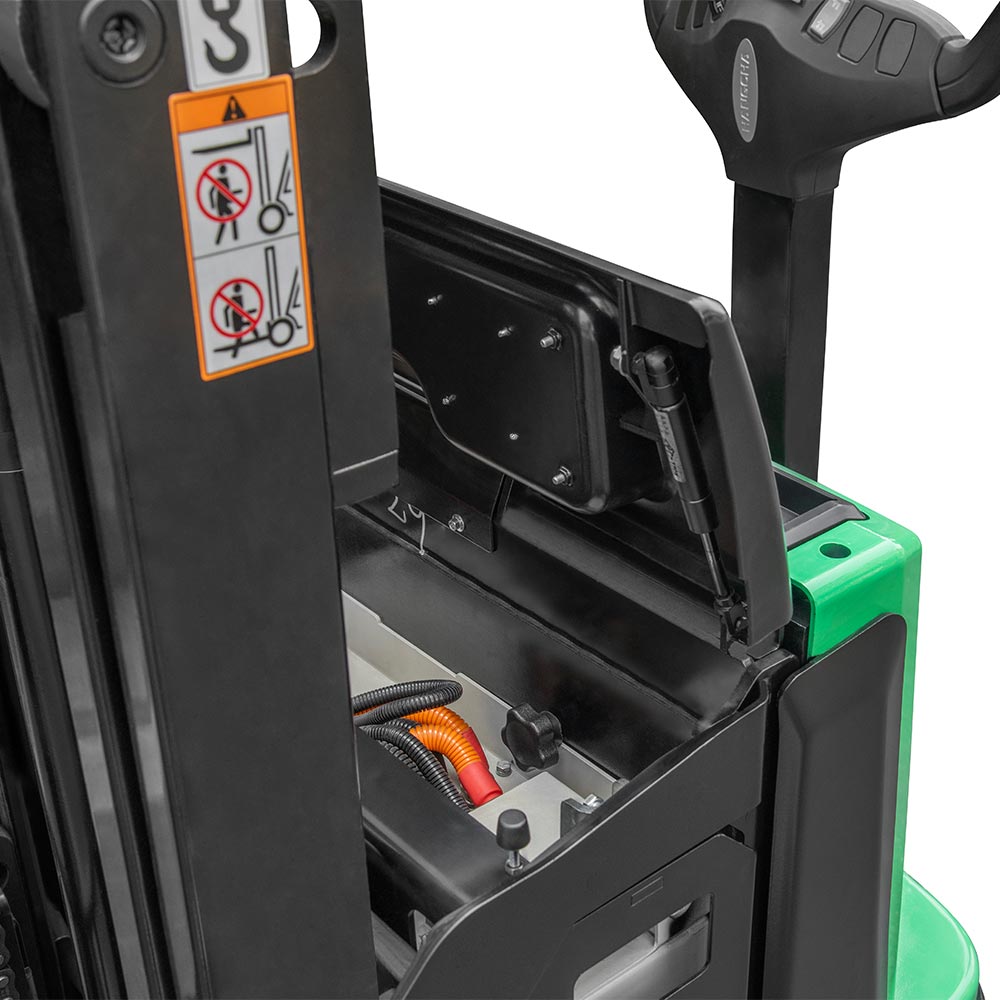 Turning speed is automatically reduced when steering (Stand-on & rider model). With three braking types: releasing brake, reversing brake and emergency brake, the driving safety has been ensured. The applied slope anti-slip function ensures the safety of the operation.