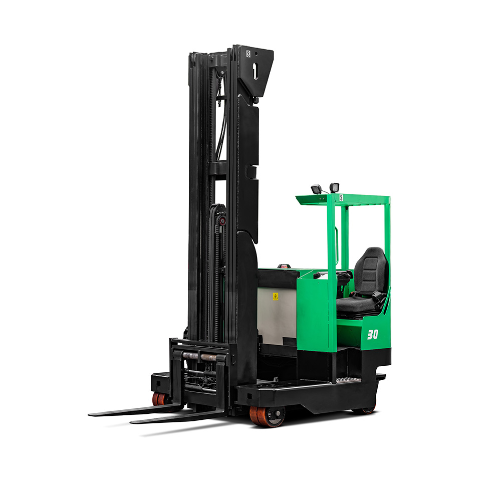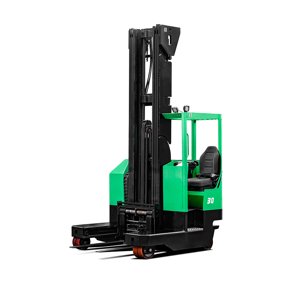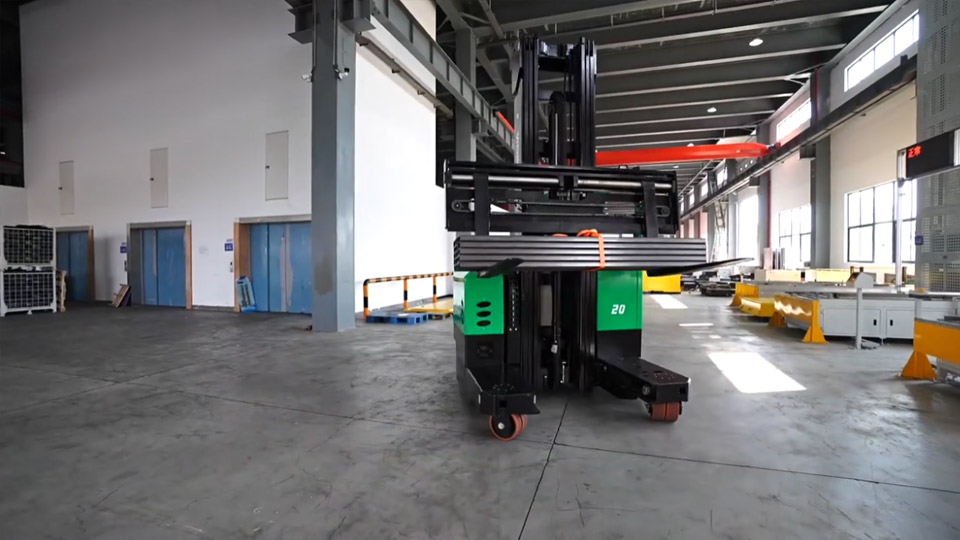 The 2-3-ton multi-lateral electric forklift can be driven in the modes of straight movement, sideways movement and 360° rotation in situ, etc. It is suitable for places with the need of handling and stacking large and long materials, such as pipes, sheets and wires, and can meet the needs of customers for operations in narrow aisles and high stacking heights.